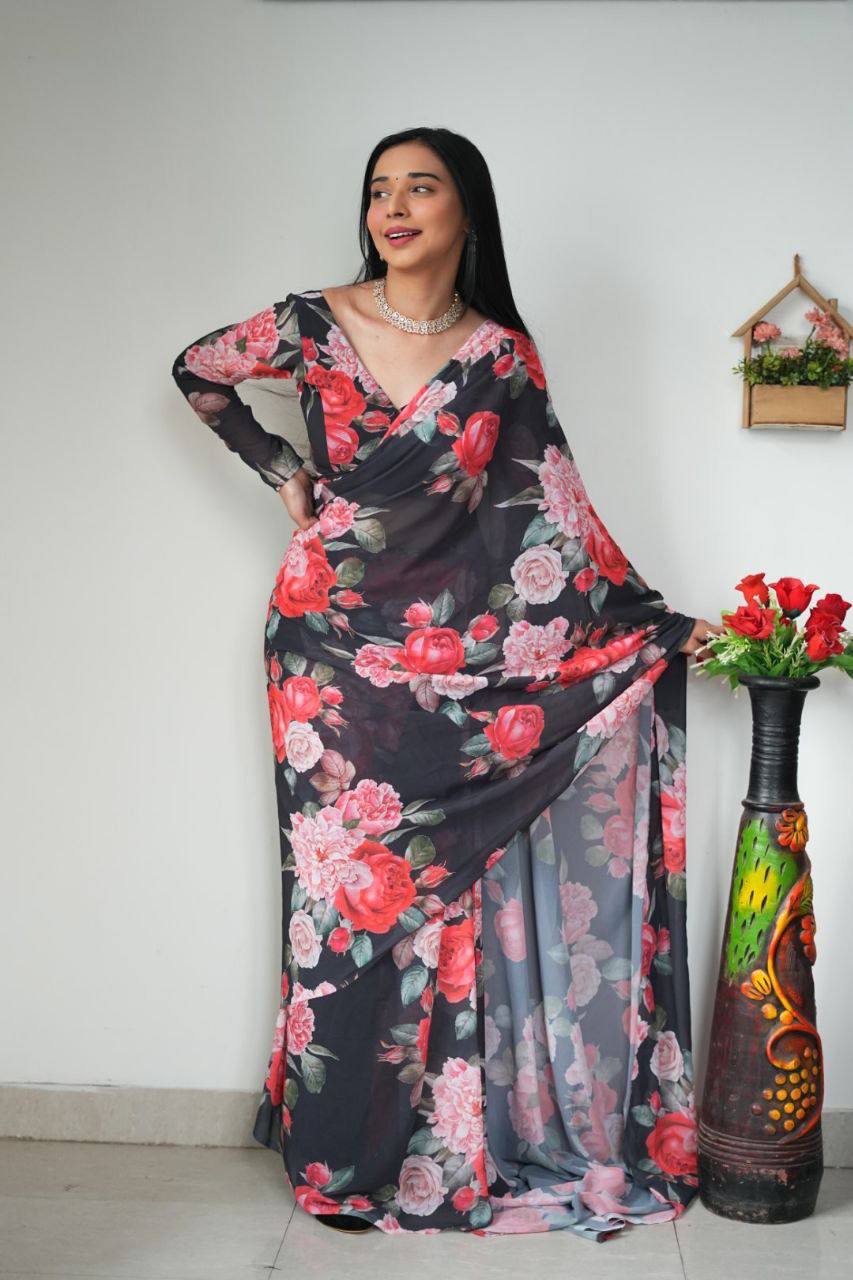 Introducing the 701-BLACK RED, a new and luxurious pure soft Georgette silk saree with a stunning pink Rose design. This ready-to-wear saree showcases a beautiful flowers design all over the body, paired with a matching blouse piece. Enjoy its bright and traditional look, with the added benefits of being light weight and easy to drape.