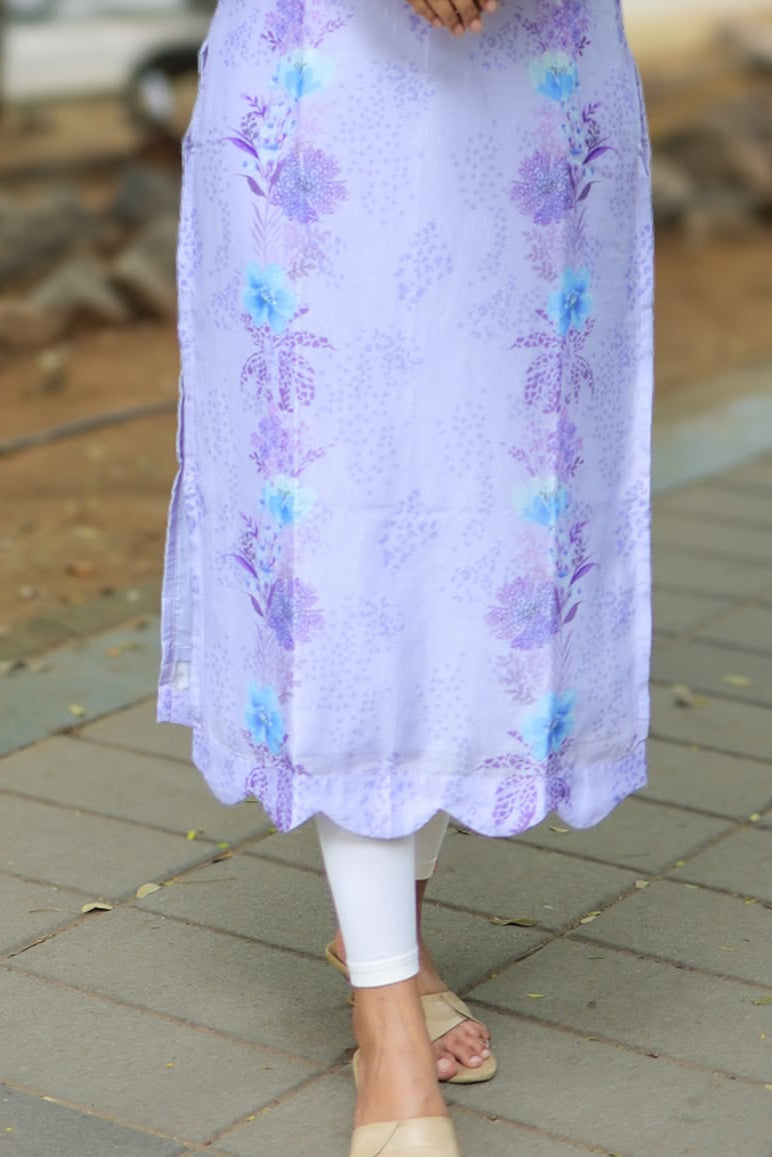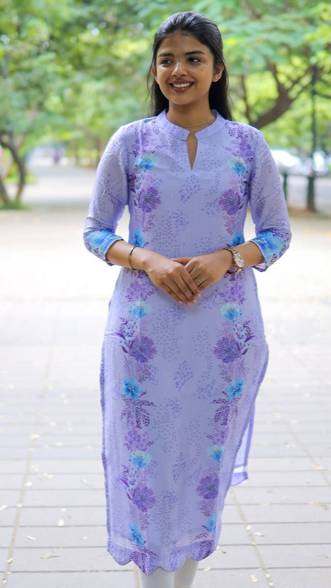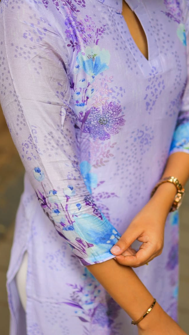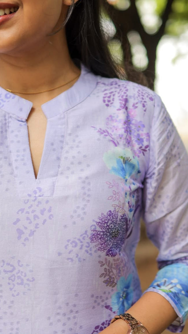 This Lavender muslin kurti features a 3/4th sleeve design and is available in sizes XS to XXXL. The top length measures 44 inches, providing a comfortable and stylish fit. Perfect for any occasion, pair it with pants for a complete look.