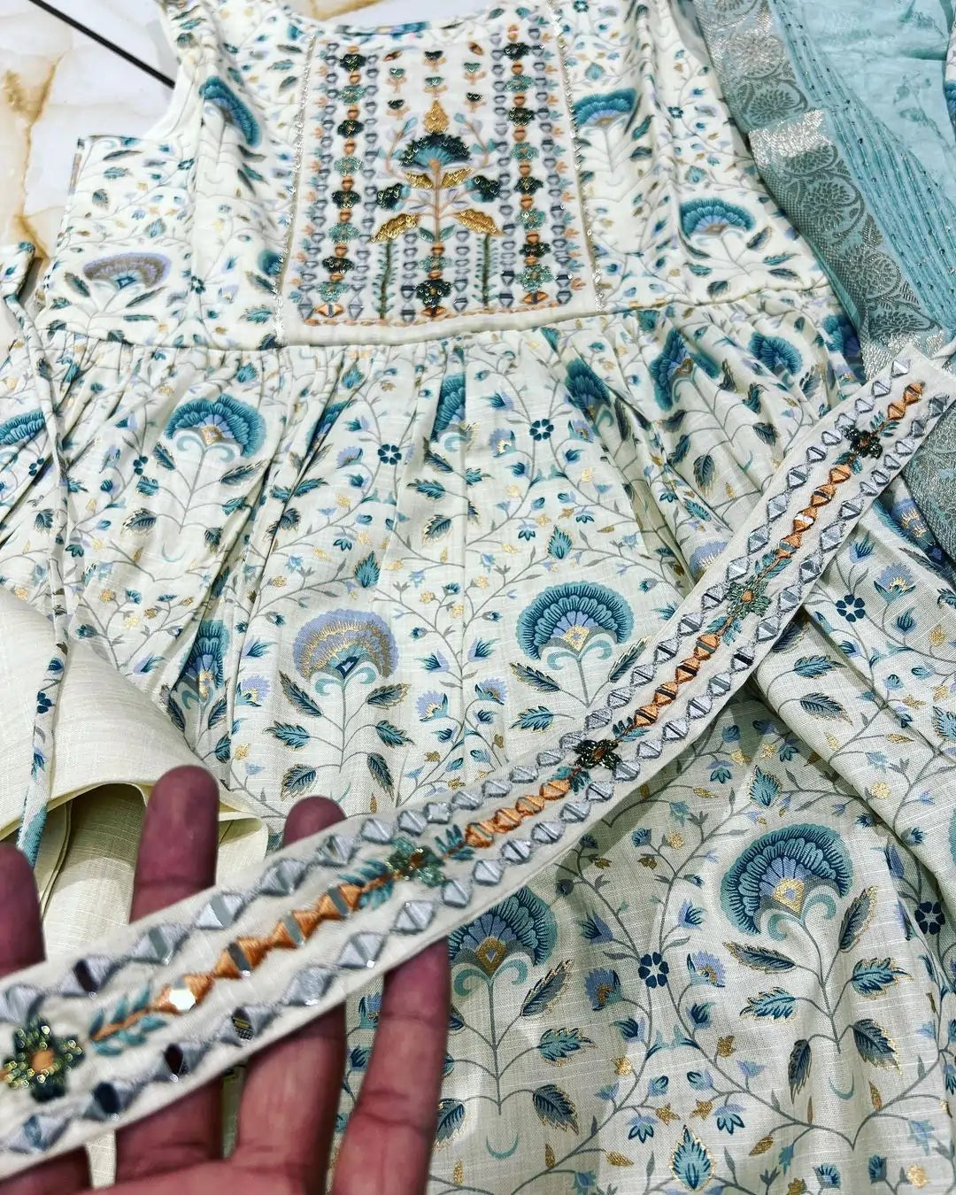 Look and feel great in this kurta from our range.  It is crafted with magic cotton. It features a sequins embroidery work on chest side and belt with digital printing.